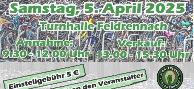 Der Freundeskreis der Sportfreunde Feldrennach veranstaltet am Samstag, den 05. April in der Turn- und Festhalle Feldrennach seinen 3. Fahrradbasar.